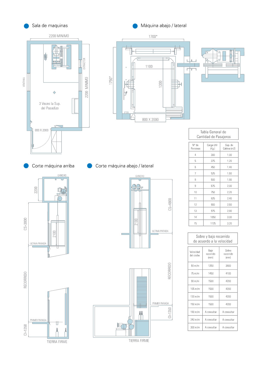 Ascensores Electromecánicos: Salas de máquinas, plantas y cortes