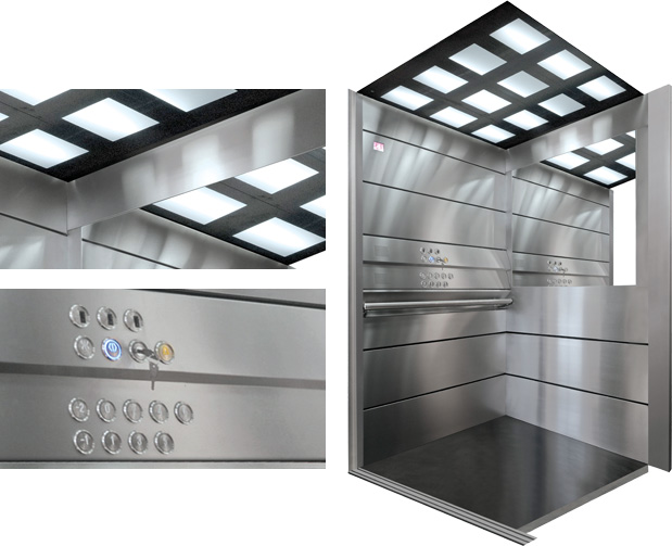 Cabina fabricada íntegramente en Ascensores Simonelli, de moderno diseño con paneles en trama horizontal totalmente en acero inoxidable y/o combinable con espejos. Pasamanos tubulares en acero inoxidable, bajopiso preparado para revestimientos. Botonera de configuración horizontal. Bajo normas de accesibilidad Ley Nº962